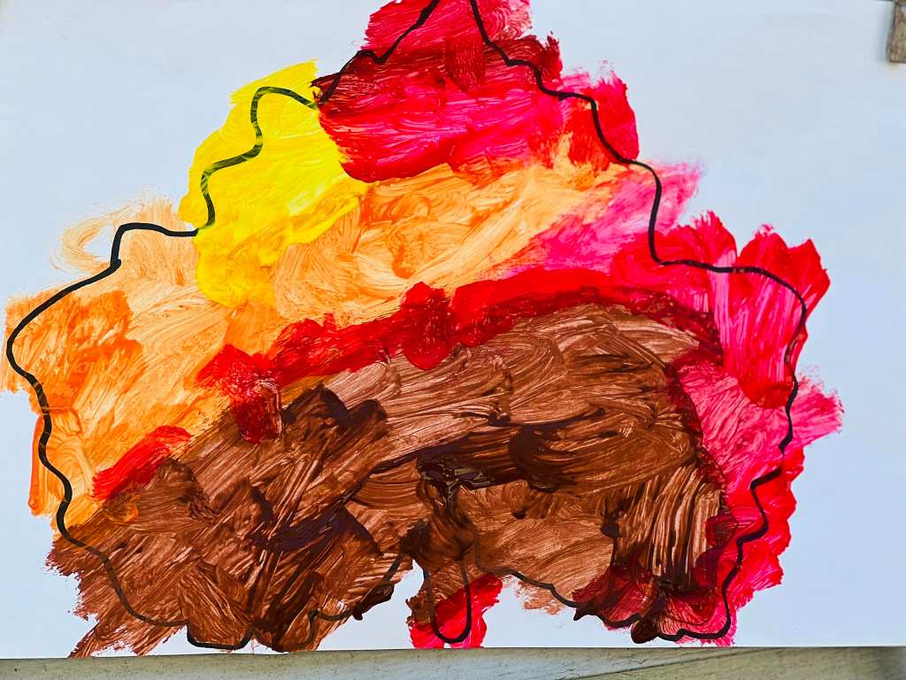 This artwork by a 2-year-old child is a vibrant exploration of colors and textures. It shows a mix of warm colors—reds, oranges, yellows, and browns—painted in large, broad strokes. The child enjoyed experimenting with how colors blend and overlap, showcasing their developing fine motor skills and curiosity about mixing colors.